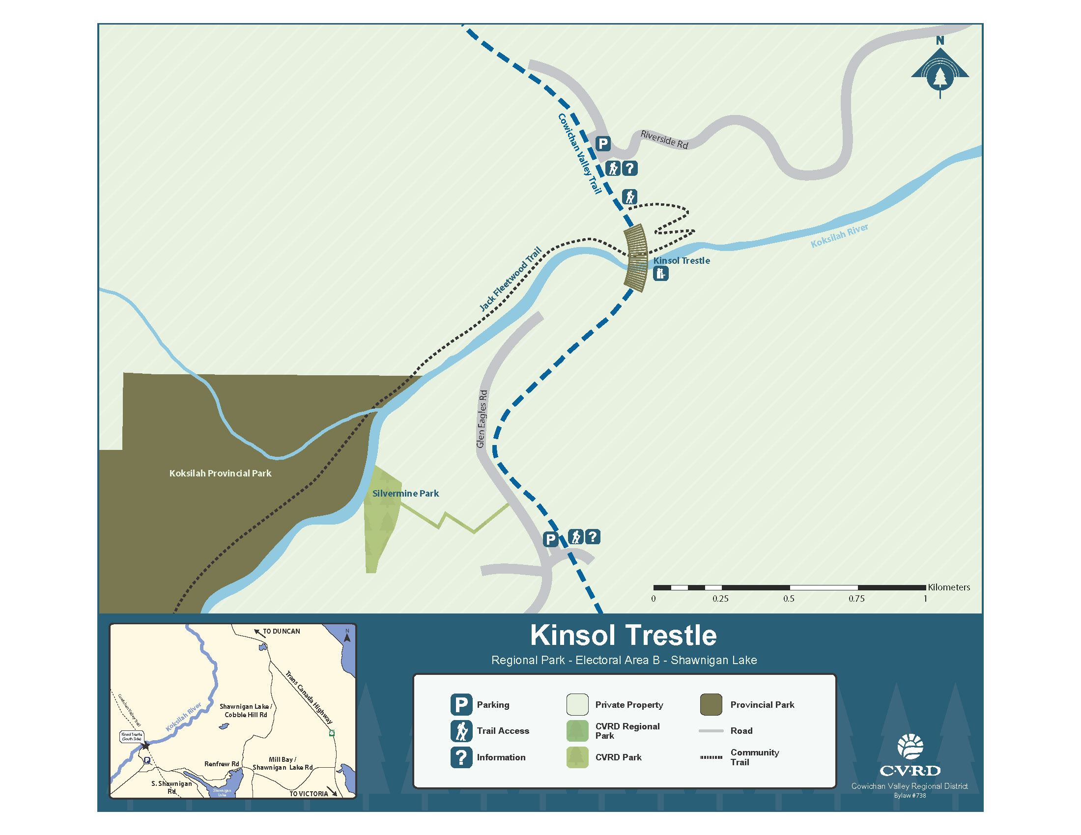 By Vehicle: Public vehicle access to the Kinsol is from Shawnigan Lake through to the south end of the trestle.
