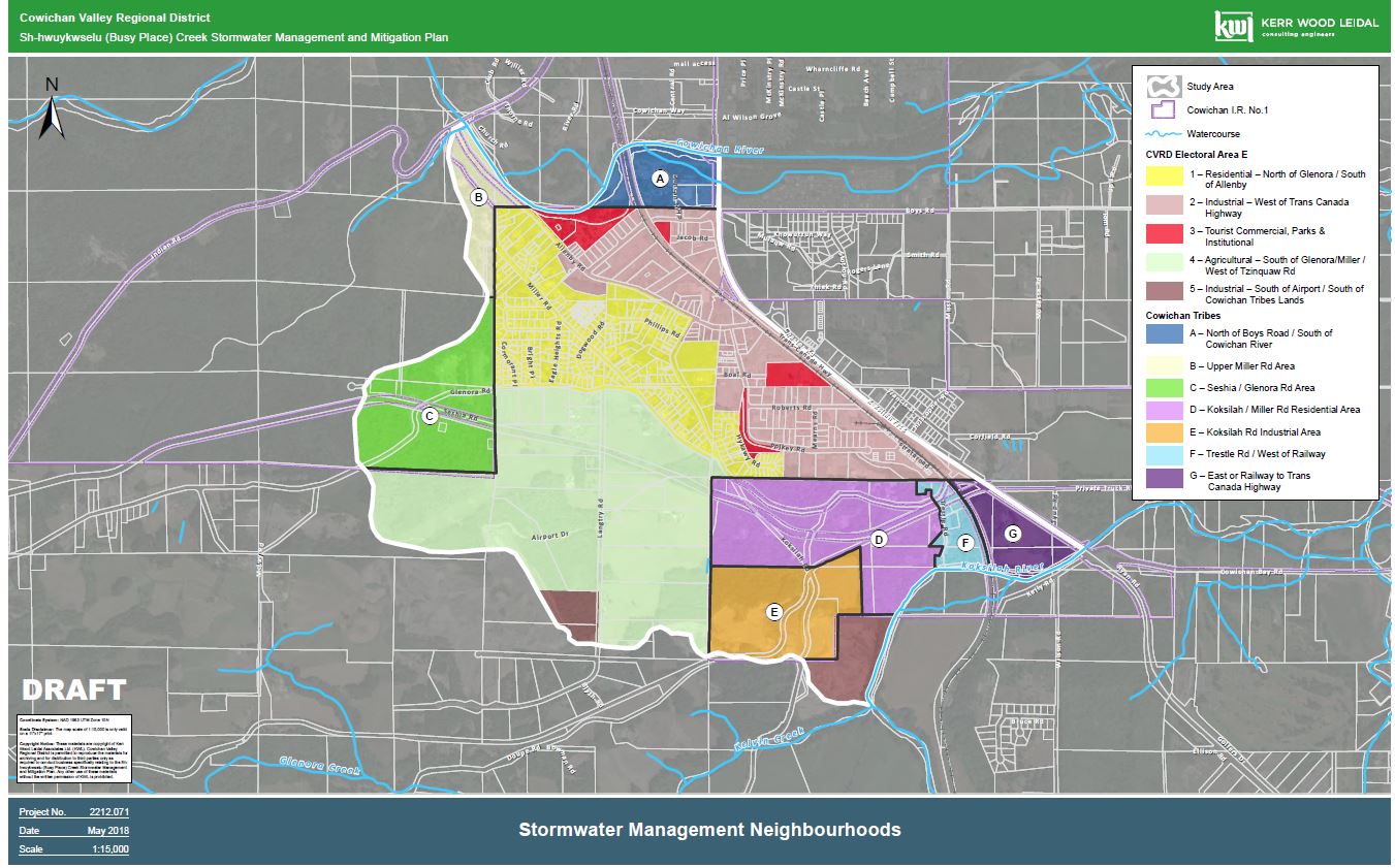 The Study area includes areas of Cowichan Tribes & CVRD Electoral Area “E” lands west of the TransCanada Highway, between the Kosilah and Cowichan Rivers, and up to the watershed boundary west of Quw’tsum Smuneem Elementary School. The Study area comprises several “stormwater management neighbourhoods” as illustrated below.